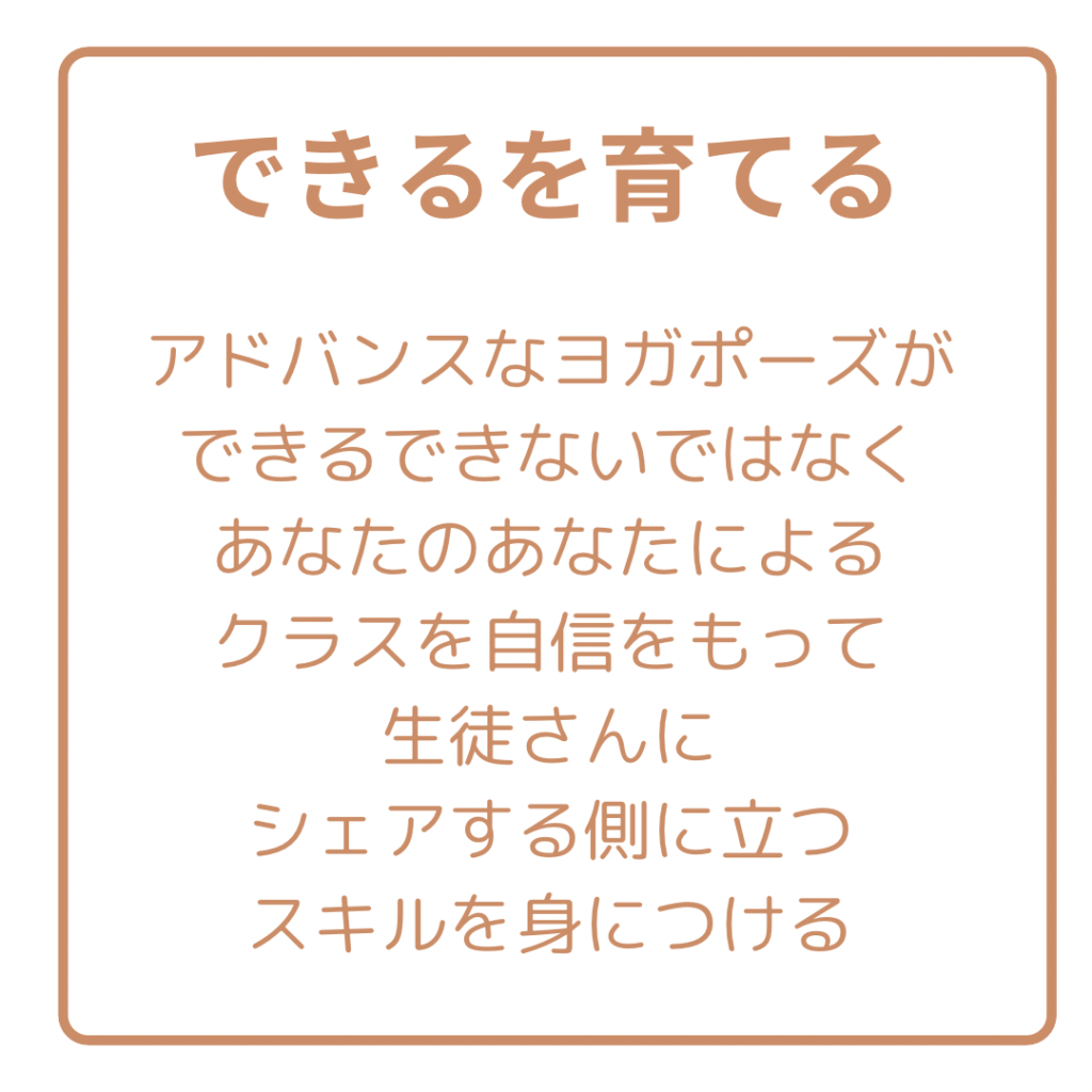 ヨガアーサナ指導法では、“できない”にフォーカスするのではなく、“できる”を少しずつ育てていきます。